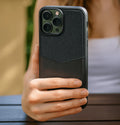 Dual-Tone Fabric & PU Leather Case – A stylish protective case with a card-slot design, combining fabric texture and faux leather for a premium, wallet-like feel.